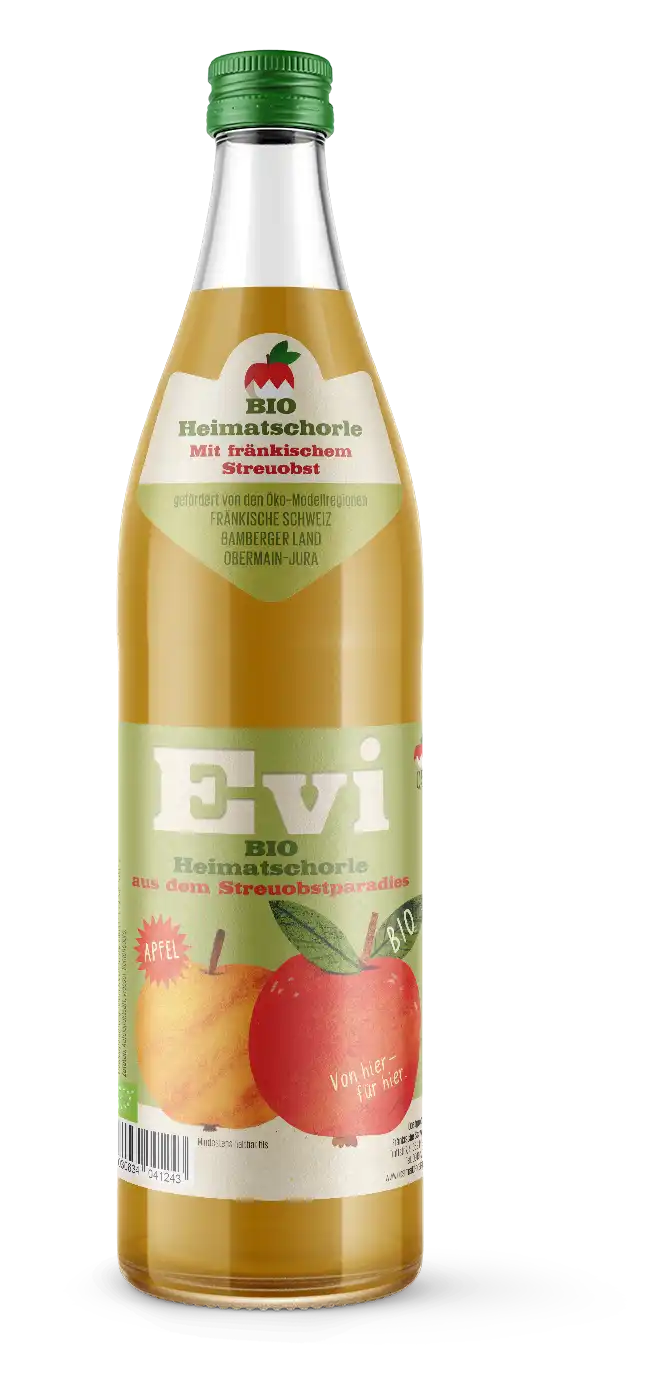 Evi ist die erste und einzige Bio Streuobst Apfelschorle aus Franken.
